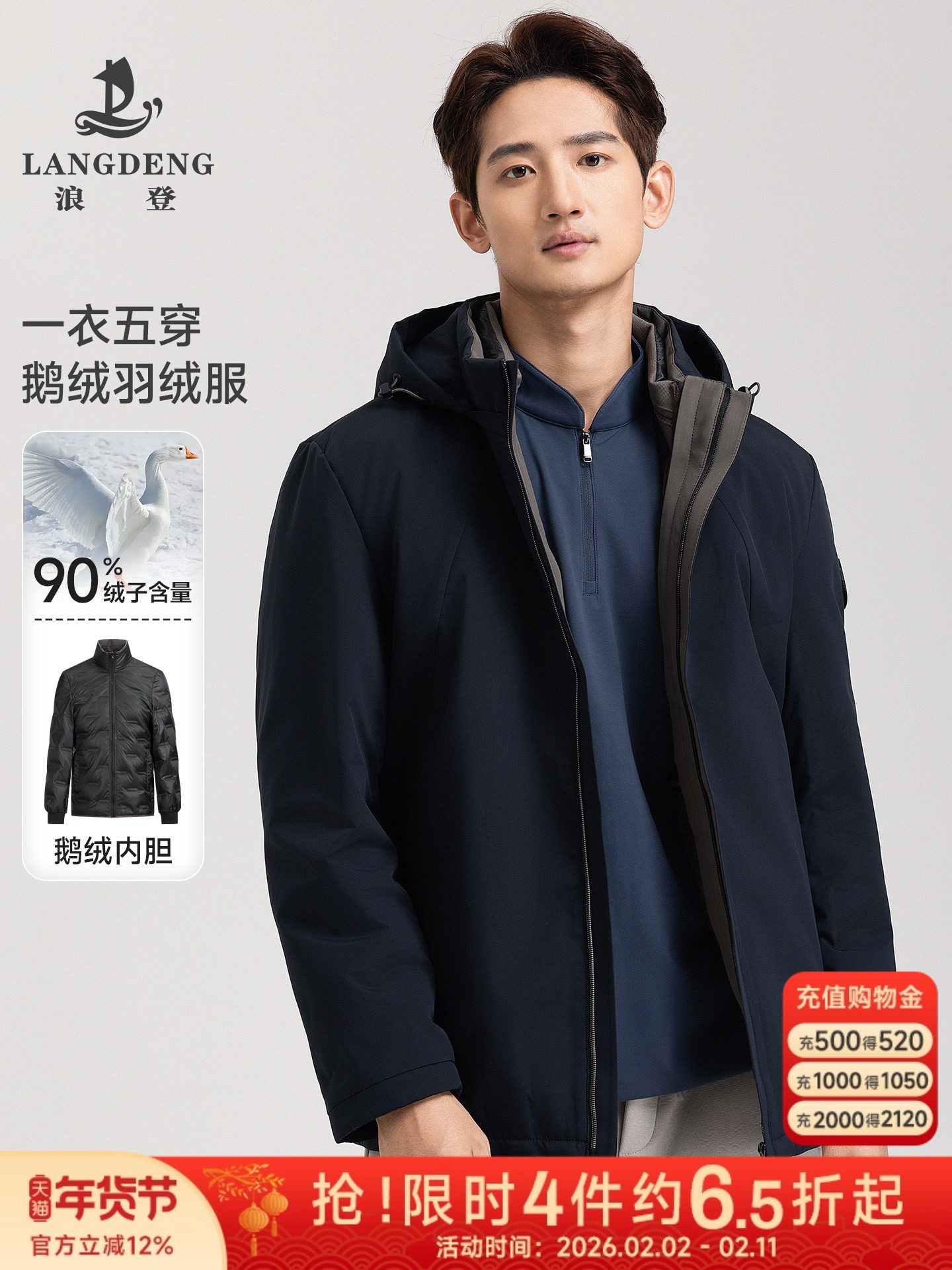 浪登三合一羽绒服连帽男士2025冬季新款保暖通勤外套