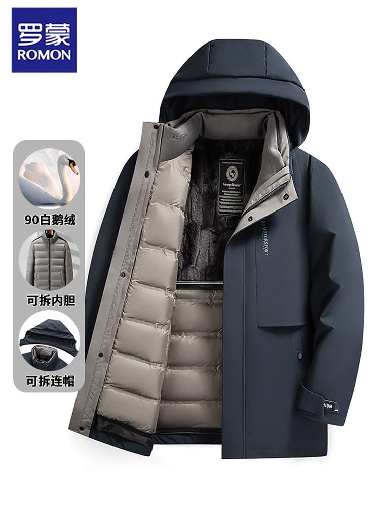 罗蒙鹅绒男士羽绒服冬季2025新款加厚可脱卸内胆中年爸爸冬装外套