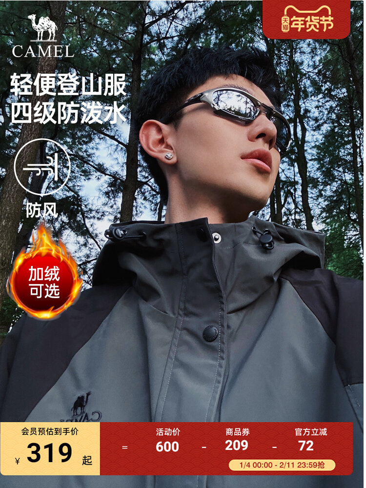 骆驼山海夹克加绒外套男秋冬款工装户外硬壳登山服防泼水旅行服女
