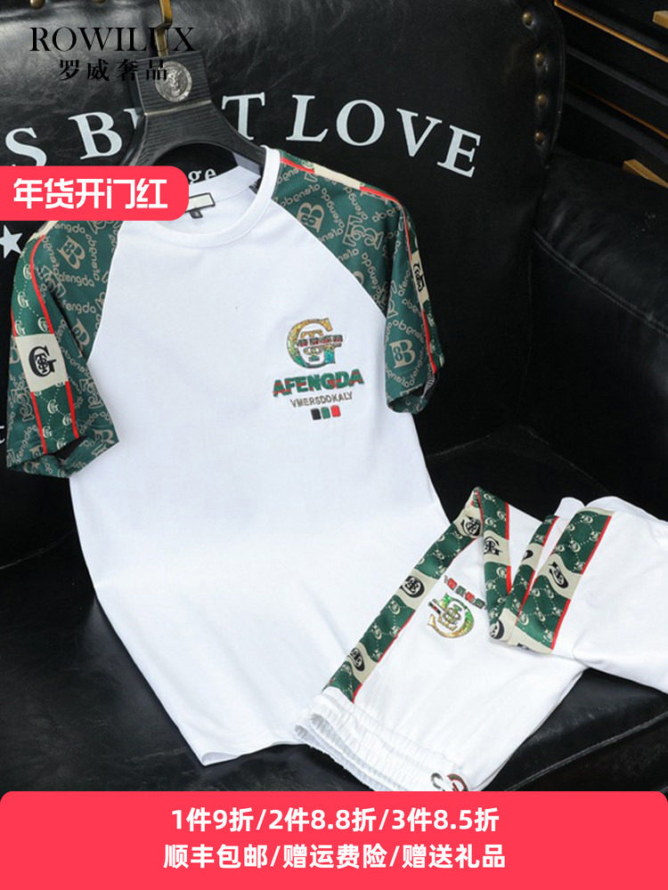 ROWILUX奢侈品印花休闲运动套装男夏季新款潮牌痞帅短袖t恤两件套