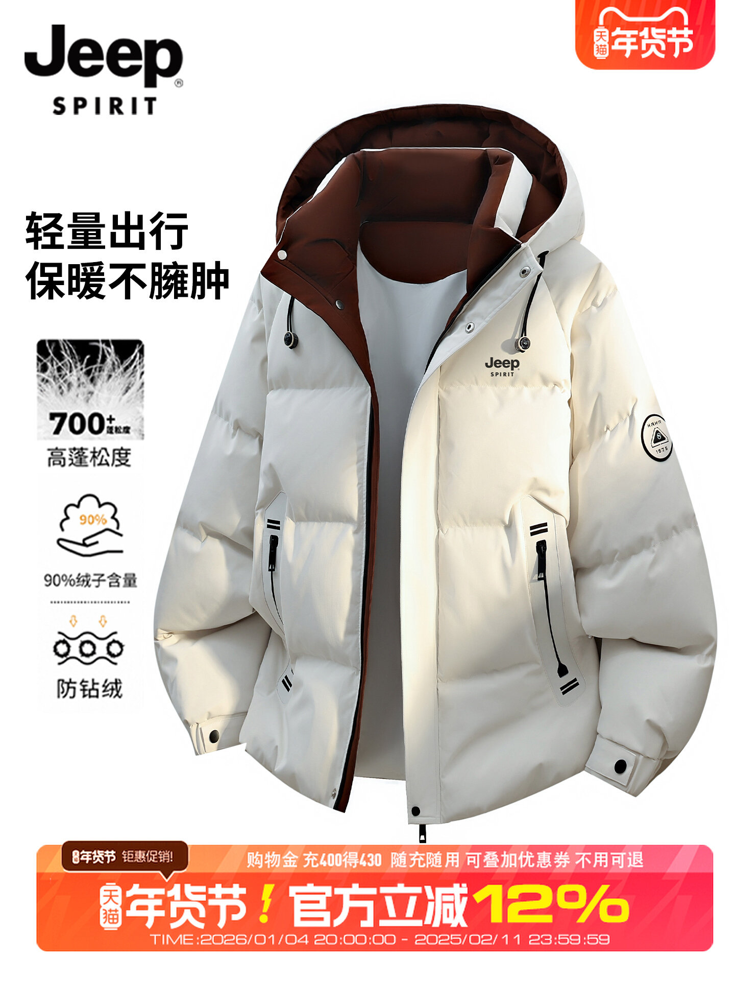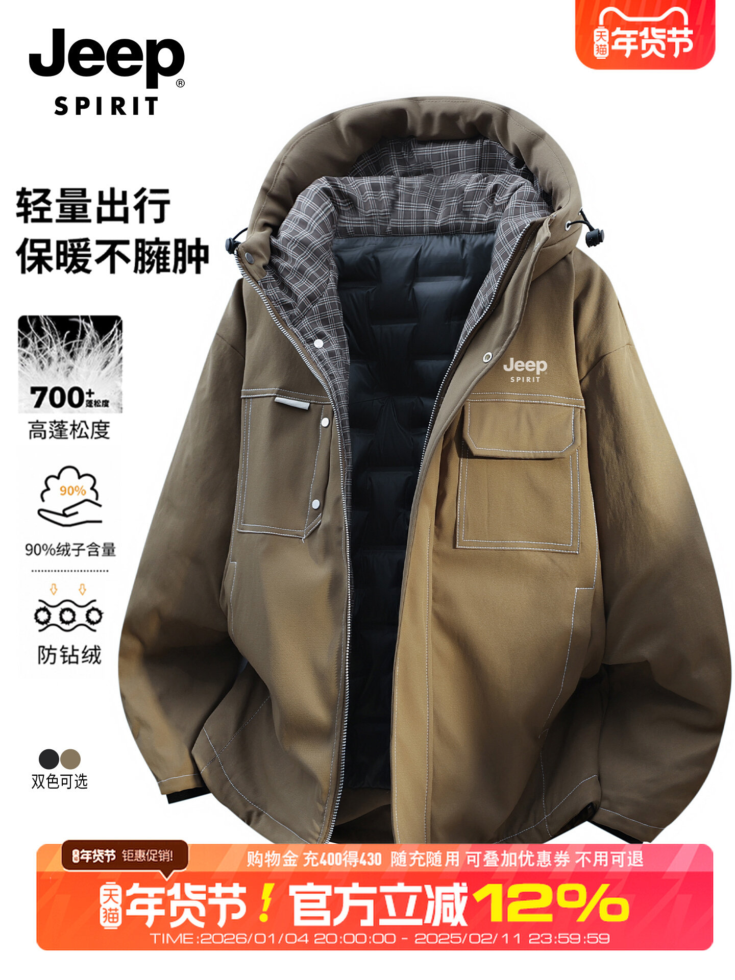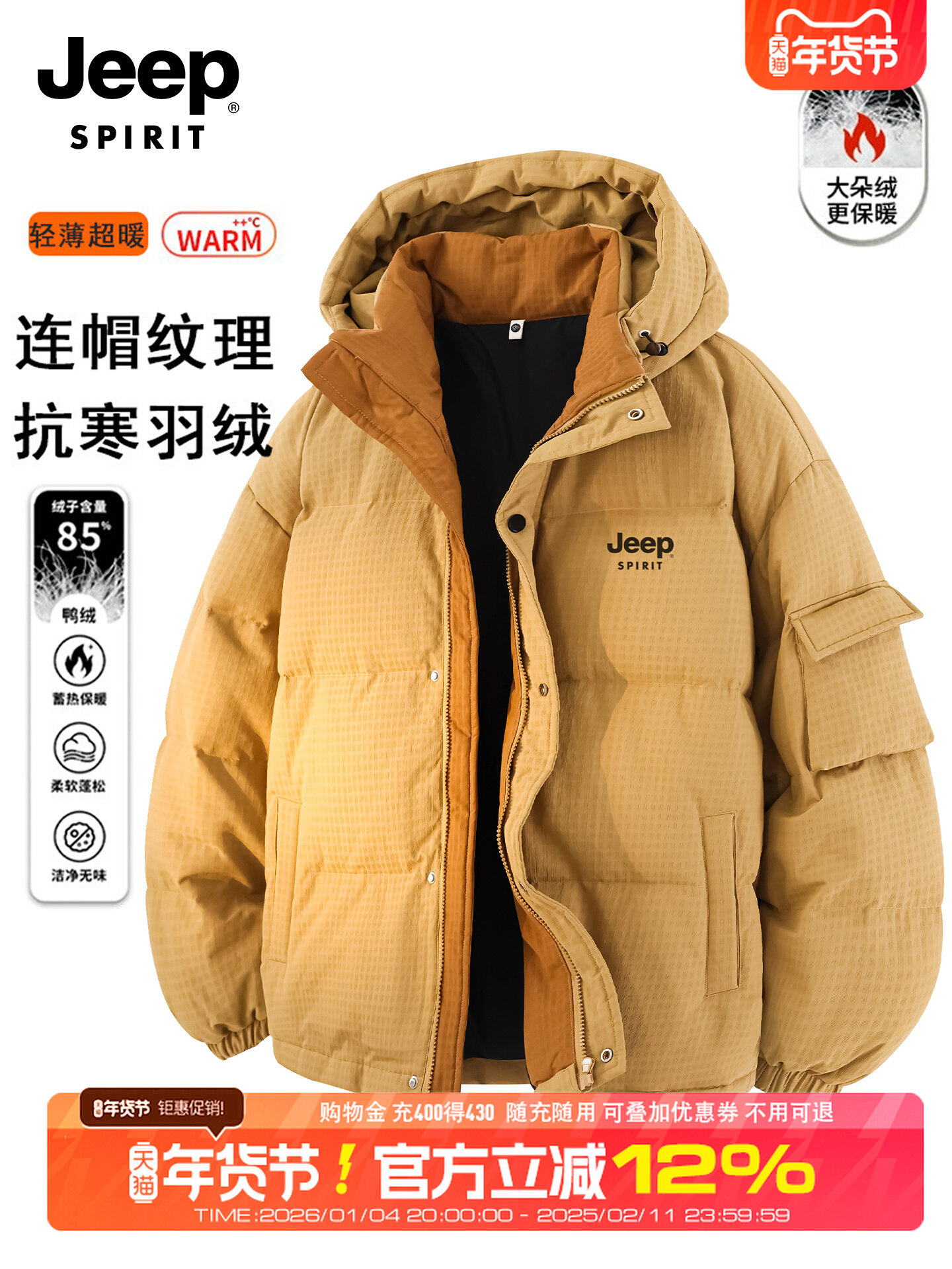 吉普户外轻薄羽绒服男士短款工装连帽外套冬季新品大码保暖夹克衫