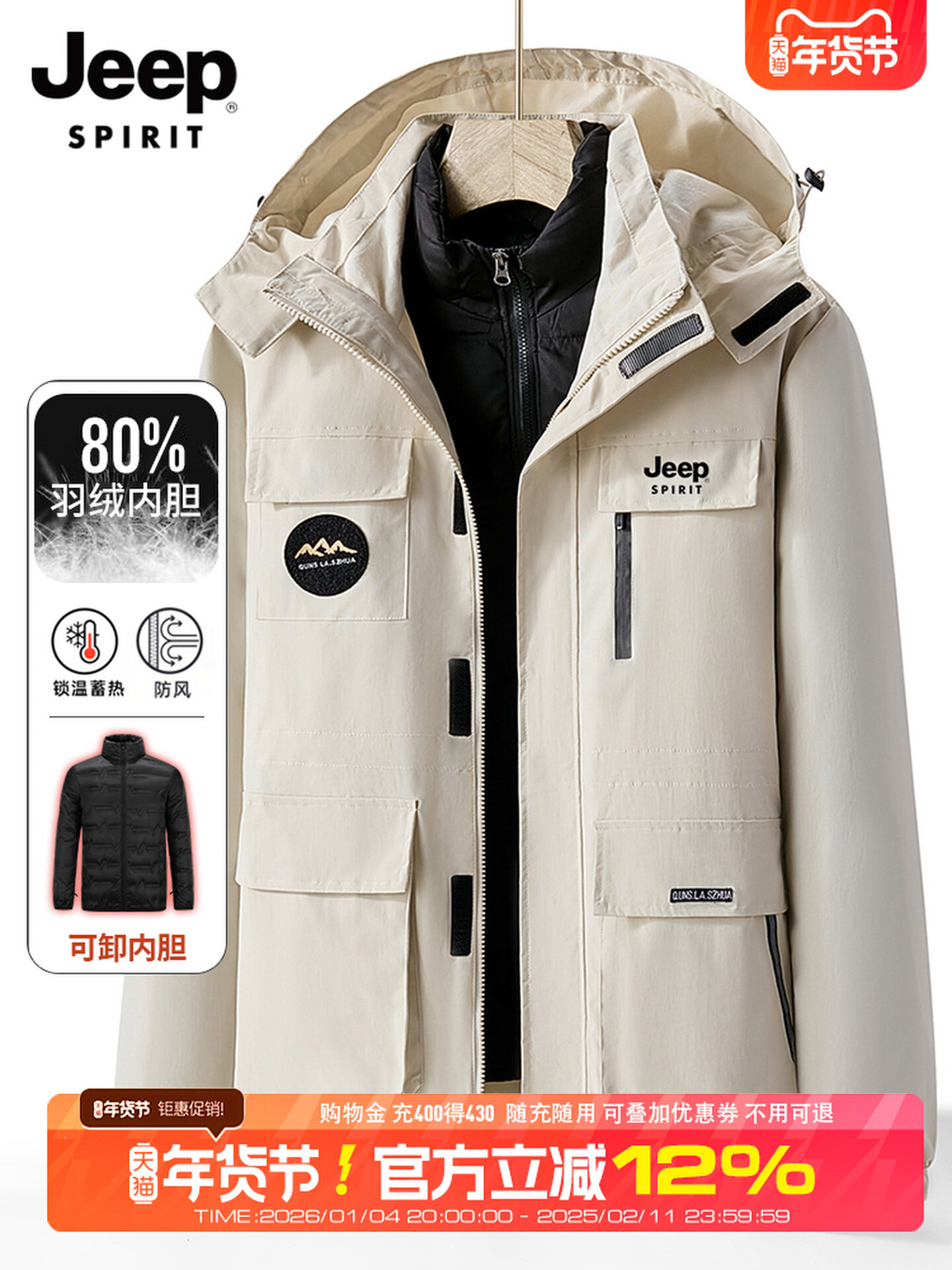 吉普官方羽绒服男款三合一冲锋大码衣服新款男装冬季男士外套冬装