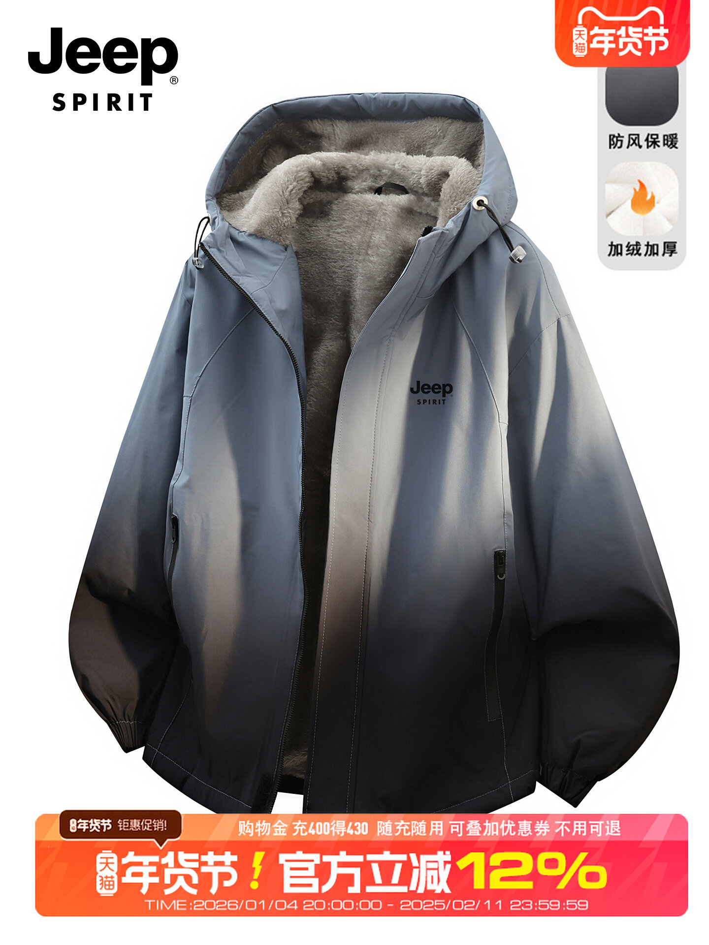 吉普美式渐变色羽绒服男士冬季新款加绒加厚保暖连帽工装夹克外套
